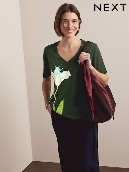 Green Flower Graphic Cotton Modal Slouch V-Neck T-Shirt